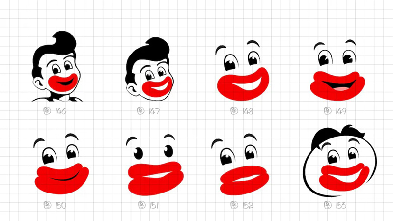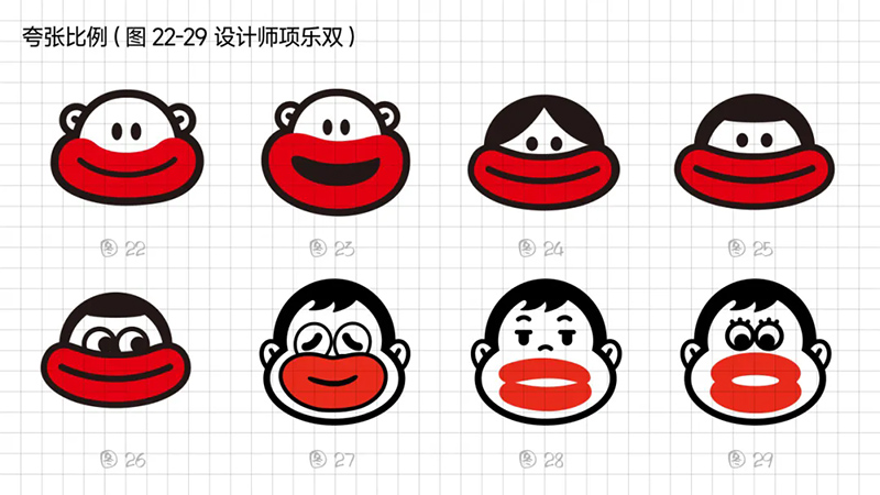1)比例夸張:平面構成中,特異是一個提升識別度和獨特性的表現手法,抓住香腸嘴“面部占比大”的特性,嘗試放大嘴唇輪廓到極致,夸張到比臉還大。