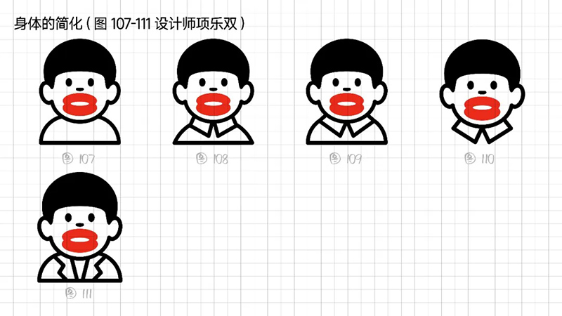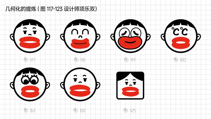 4)去外輪廓的改變:堅持簡化思路,那能不能更加簡練呢?可以把能識別出臉所有元素簡化、虛化、甚至刪除嗎?嘗試只保留眼睛、眉毛、嘴巴,就能識別。但是去掉外輪廓的表現手法,會使得整體圖形顯得散。